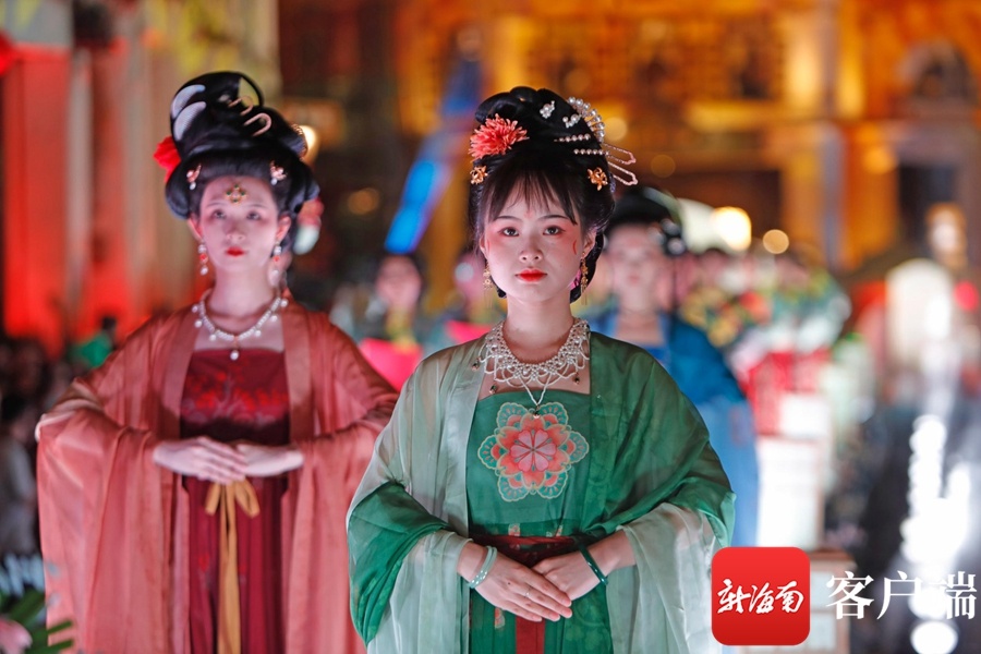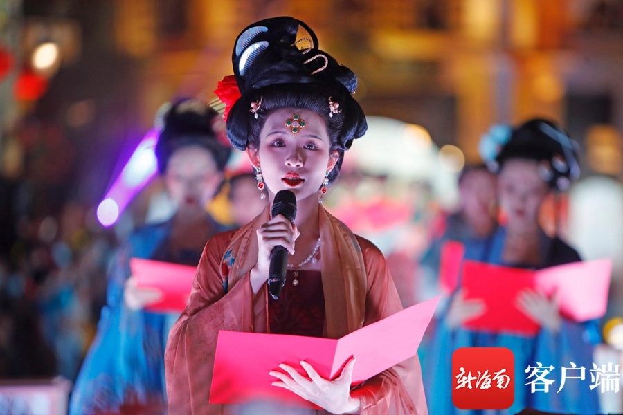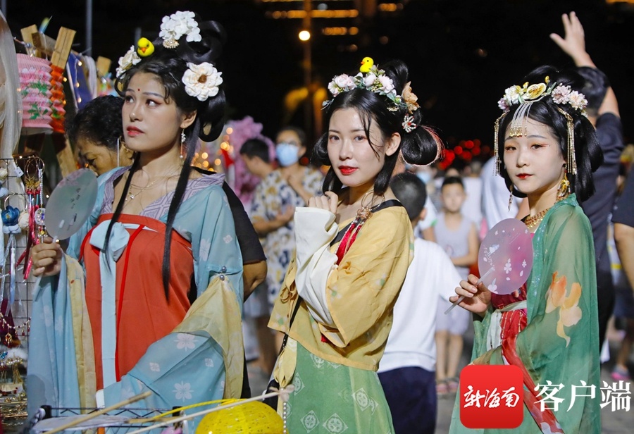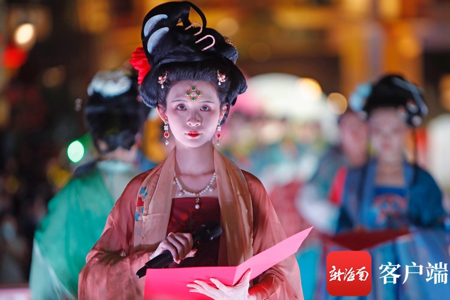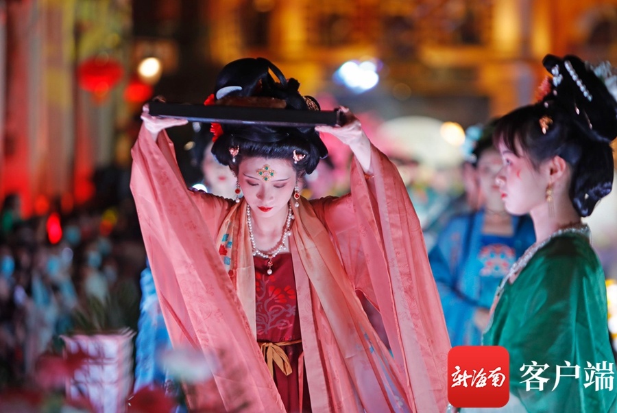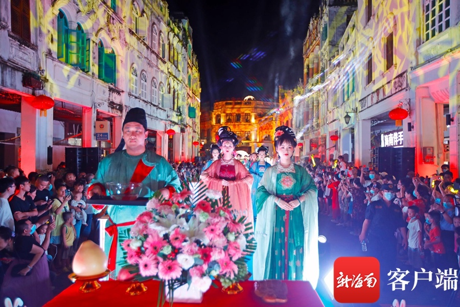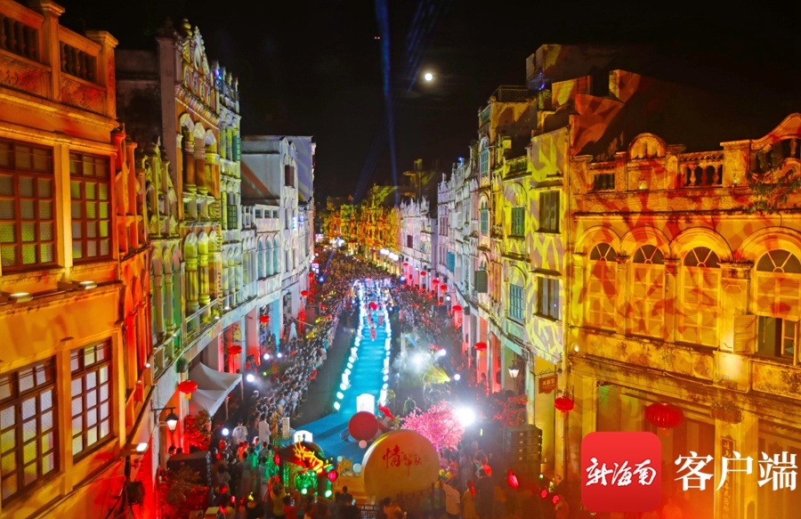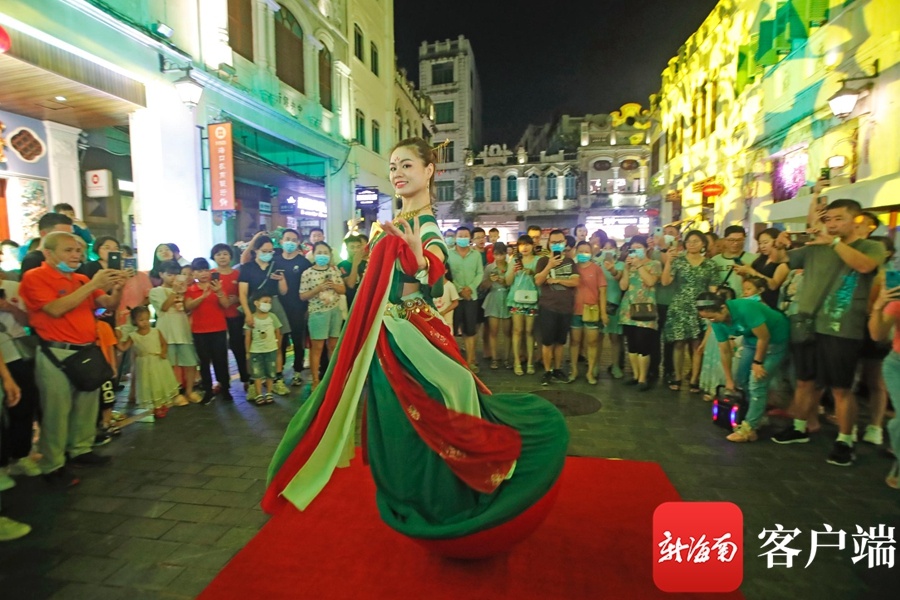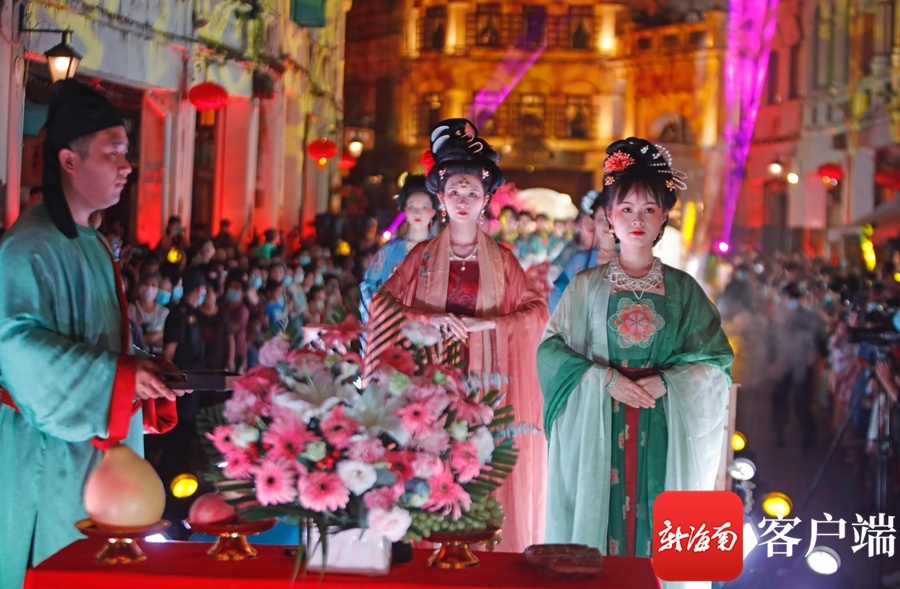 新海南客户端、南海网、南国都市报9月21日消息(记者汪承贤)9月21日晚,在海口骑楼老街,开展中秋祭月活动拉开了中秋国风主题演出的序幕。创新的舞台形式,梦幻炫目的灯光,韵味十足的节目表演,历史与时尚在此交汇,骑楼老街摇身一变,成为展示国风魅力的秀场。在这里上演的汉服秀、国风诵读等节目,演绎着国风雅韵,为大家展示了一场华美缤纷的视觉盛宴。