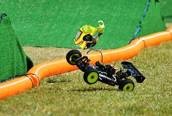 救援人员正在将翻倒的赛车扶正继续比赛。