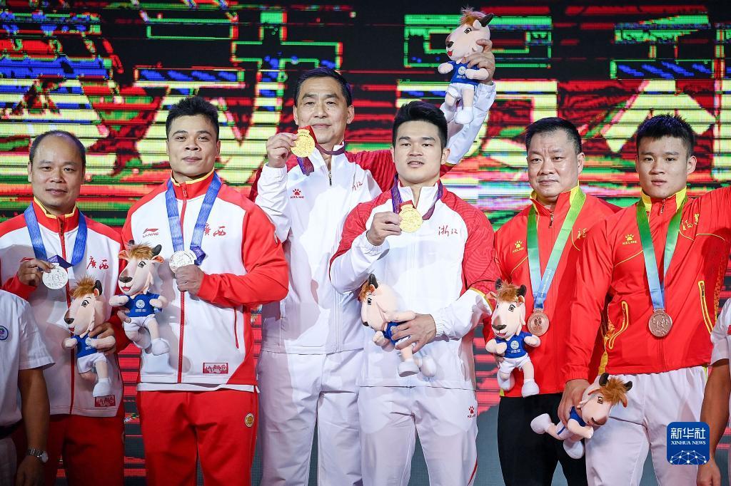 9月22日,冠军浙江队选手石智勇(左四)和教练邵国强(左三)、亚军广西队选手韦胤廷(左二)和教练陶闯(左一)、季军福建队选手袁程飞(右一)和教练万建辉在颁奖仪式上。