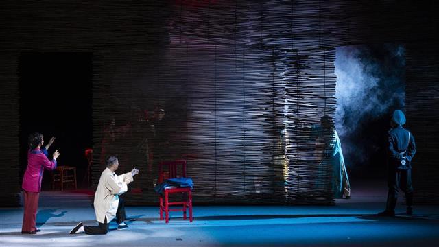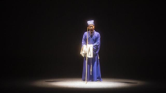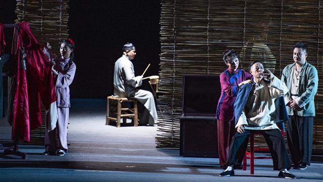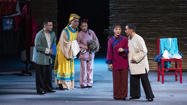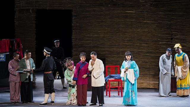 9月22日晚,由天门市花鼓戏剧院创排的大型原创红色题材荆州花鼓戏《亮相》,在武汉市艺术学校实验剧场上演。《亮相》讲述了一个唱戏、教戏的艺人沈海清,在时代浪潮的裹挟中,逐步走上革命道路的曲折故事。通过戏班被焚、上门索赔、探寻革命、堂会卧底、决定救人、勇闯法场等剧情,一步步展现了沈海清从胆小怯弱到勇敢面对人生的传奇过程中,着重凸显出了人物由一个“小丑”走向“大武生”的发展与升华。同时也折射出以沈海清为主的一群小人物,在那饱经风霜、苦难深重的民族危困之际的智慧和担当,以及他们的生命底色与情怀。(湖北日报全媒记者 何宇欣 摄)