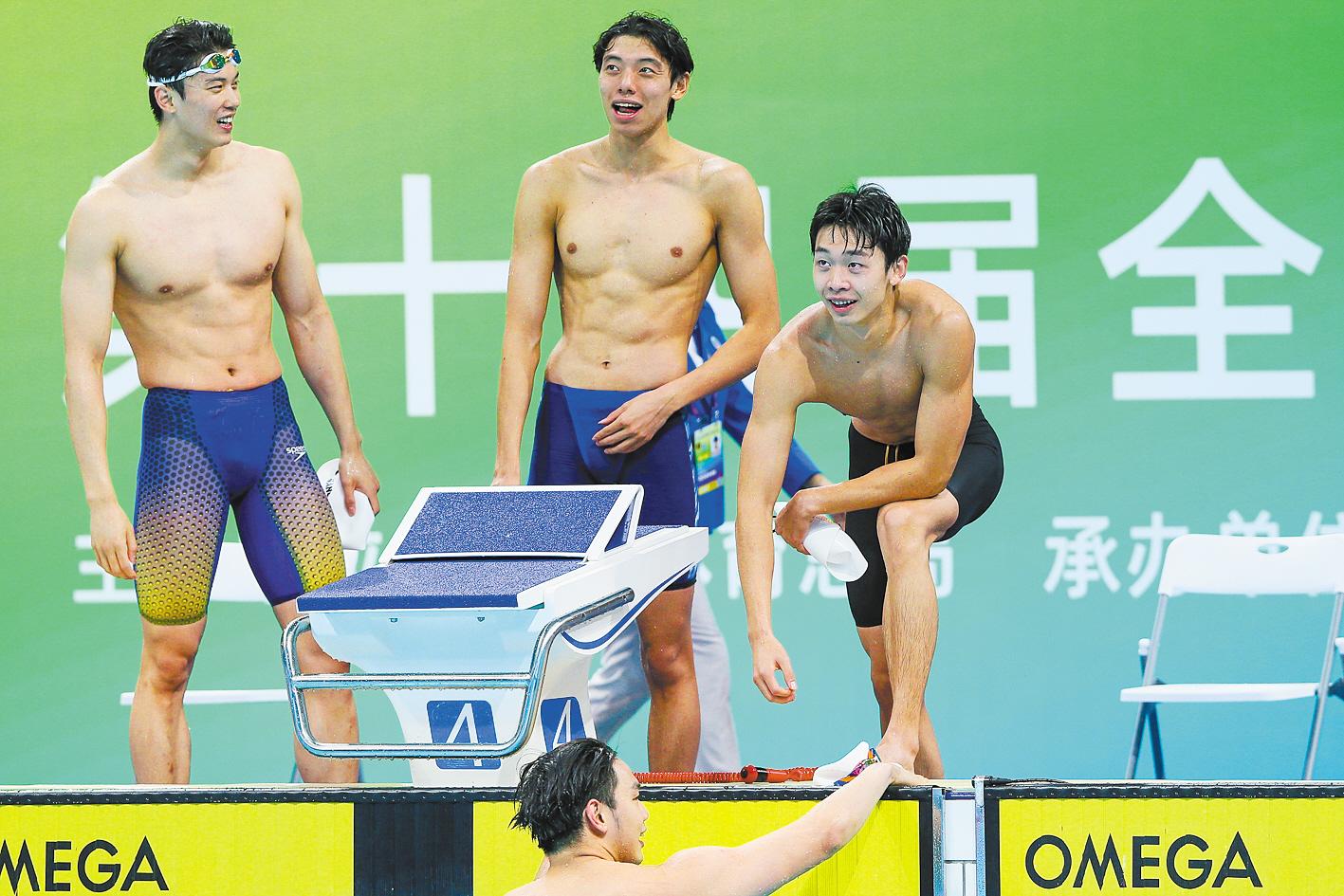 洪金权率先触壁夺冠后,岸上的联合队汪顺、季新杰、张子扬笑逐颜开。 (湖北日报全媒记者 时龚 摄)