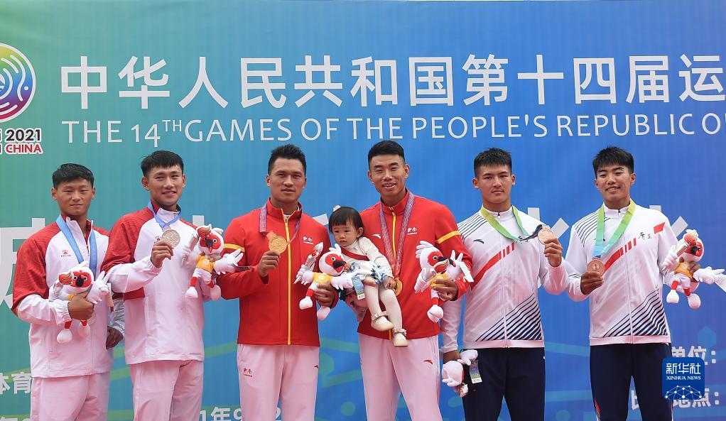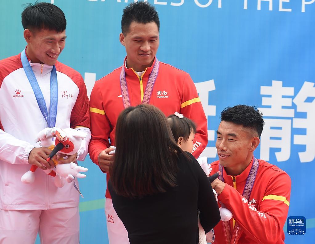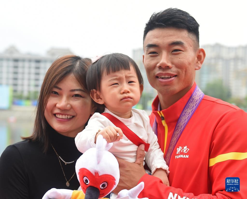 9月23日,冠军联合队选手郑鹏飞(右一)在颁奖仪式上抱起女儿。