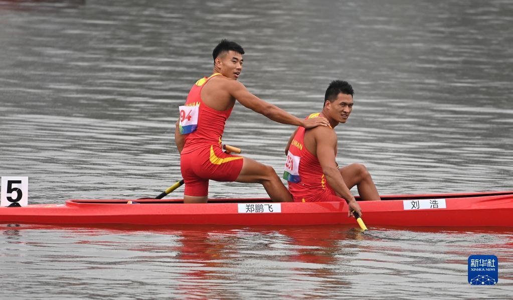 9月23日,联合队组合刘浩(右)/郑鹏飞在比赛后,他们以3分35秒185的成绩获得冠军。