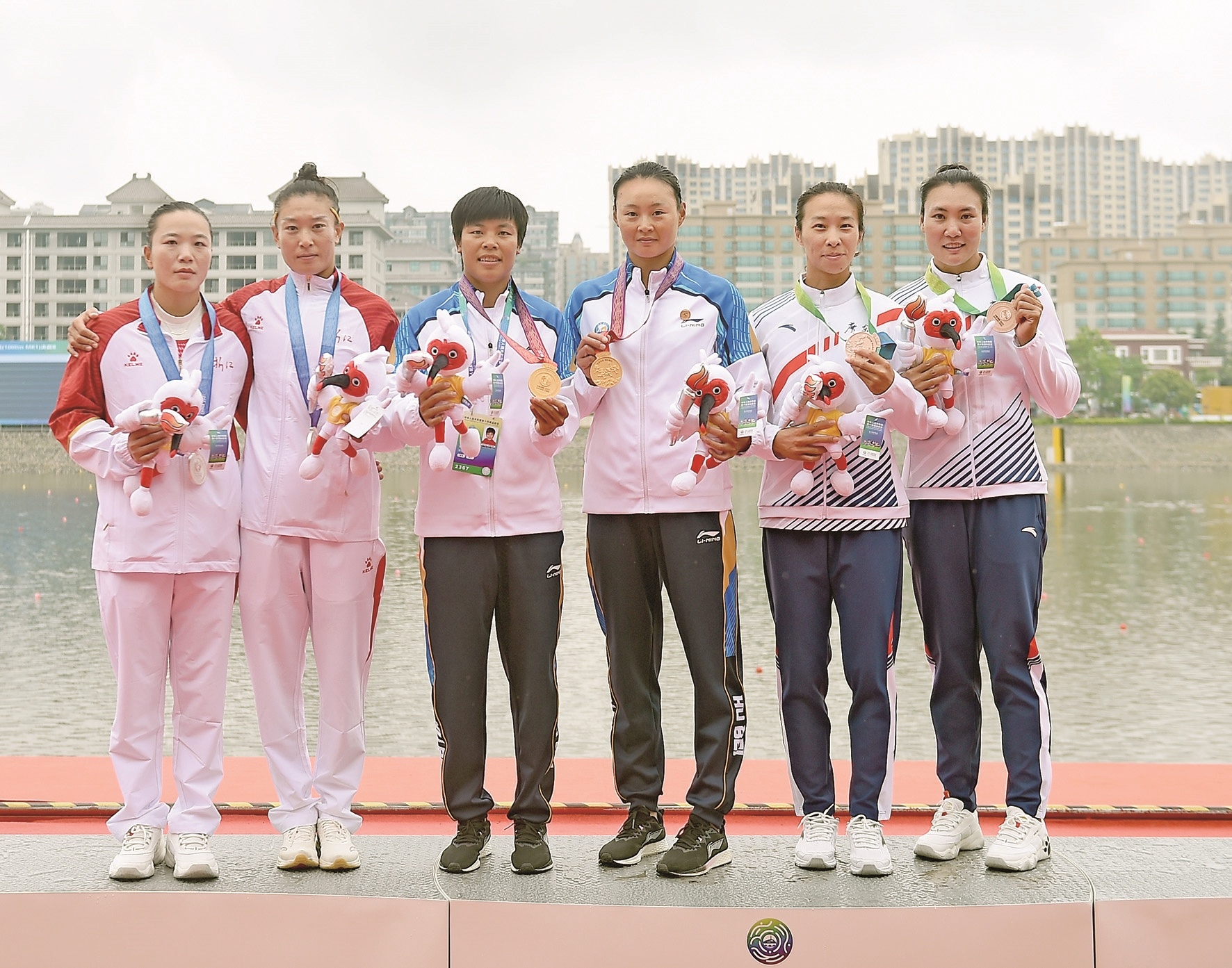 田盛芳(左三)和孙悦雯(右三)登上最高领奖台 新华社发