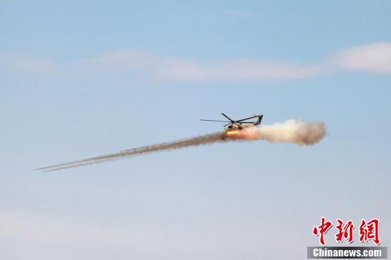 当地时间9月23日,“和平使命-2021”上合组织联合反恐军事演习实施实兵行动。图为参演武装直升机开火瞬间。 中新社记者 李纯 摄