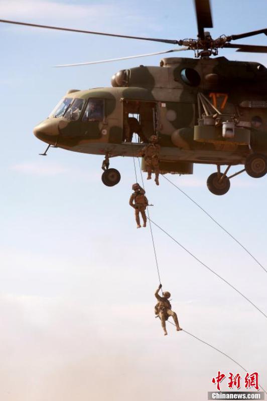 当地时间9月23日,“和平使命-2021”上合组织联合反恐军事演习实施实兵行动。图为特战队员从直升机索降。 中新社记者 李纯 摄