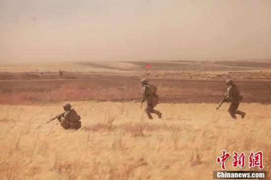 当地时间9月23日,“和平使命-2021”上合组织联合反恐军事演习实施实兵行动。图为特战队员索降至地面后快速占领有利地形。 中新社记者 李纯 摄