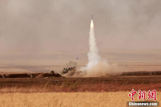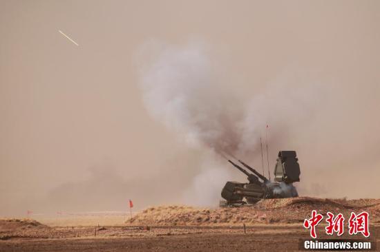 当地时间9月23日,“和平使命-2021”上合组织联合反恐军事演习实施实兵行动。图为参演武器开火瞬间。 中新社记者 李纯 摄