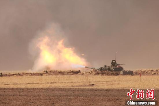 当地时间9月23日,“和平使命-2021”上合组织联合反恐军事演习实施实兵行动。图为参演坦克开火瞬间。 中新社记者 李纯 摄