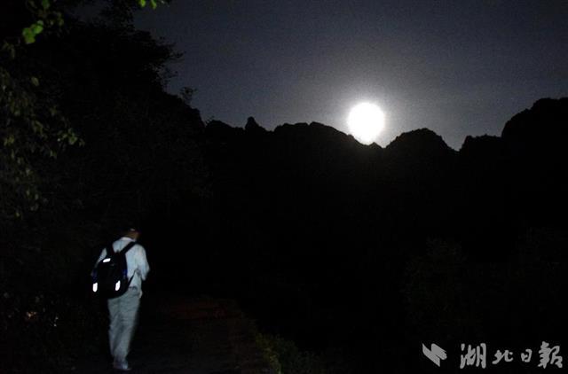9月20日凌晨3点,十堰市武当山南岩附近宾馆和旅店里的游客,勿勿吃过早饭后,三三两两相约,趁着月色向武当山主峰天柱峰方向出发,登顶看日出、赏美景。(湖北日报通讯员周家山 摄)