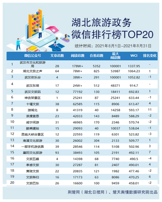 湖北旅游政务微信WCI指数TOP20具体排名如下: