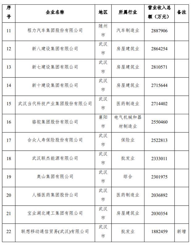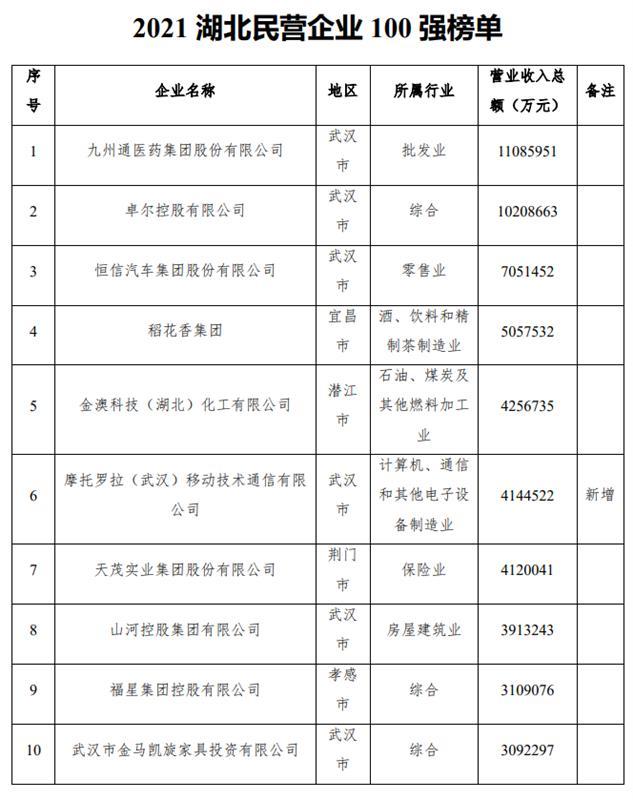 9月24日下午,湖北省工商联发布2021湖北民营企业百强榜单。九州通医药集团股份有限公司、卓尔控股有限公司、恒信汽车集团股份有限公司继续保持前三位。