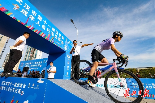 长江日报大武汉客户端9月25日讯(记者张衡 通讯员孙克亮 胡莎) 9月25日上午8时10分,蔡甸区花博汇景区北门前,随着裁判员一声令下,发车台上首位破风者、青山区选手徐兆睿铆足劲,如箭离弦冲出起点。当天,武汉市第十一届运动会成年人自行车赛顺利举行,全市110名公路自行车选手在“花海”追风,上演速度与激情。
