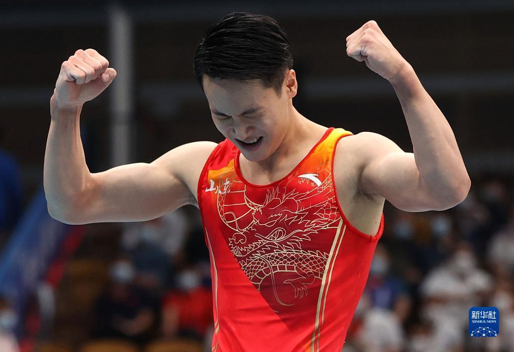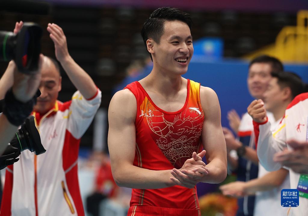 9月25日,山东队选手苏炜德在男子自由体操比赛后庆祝。