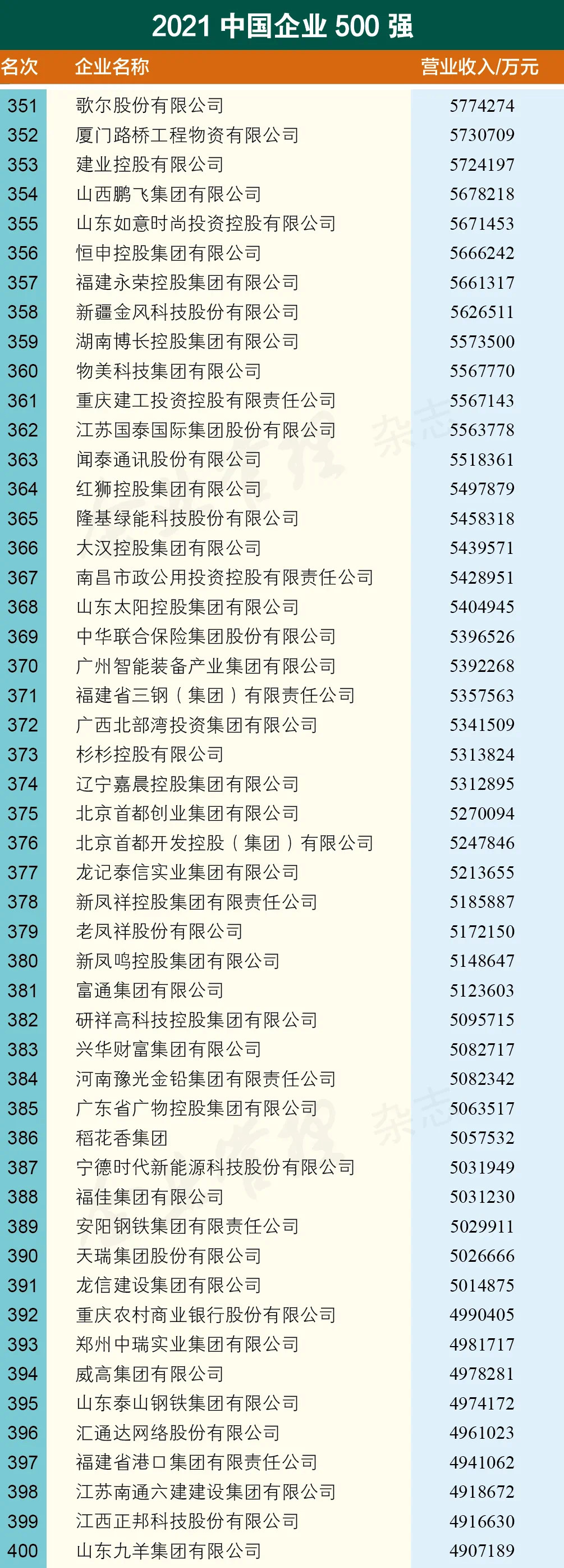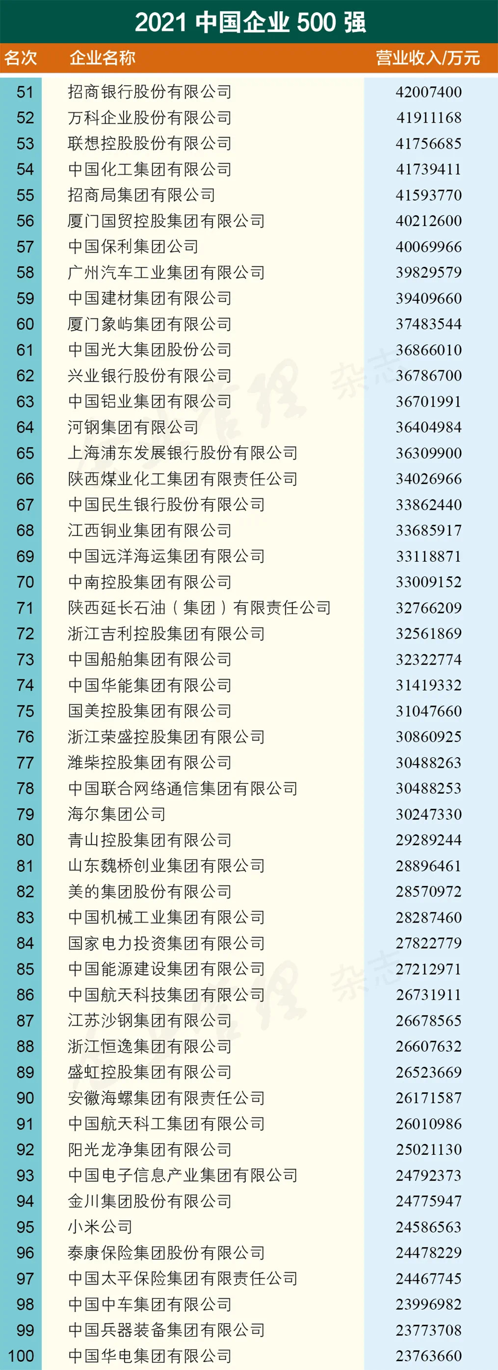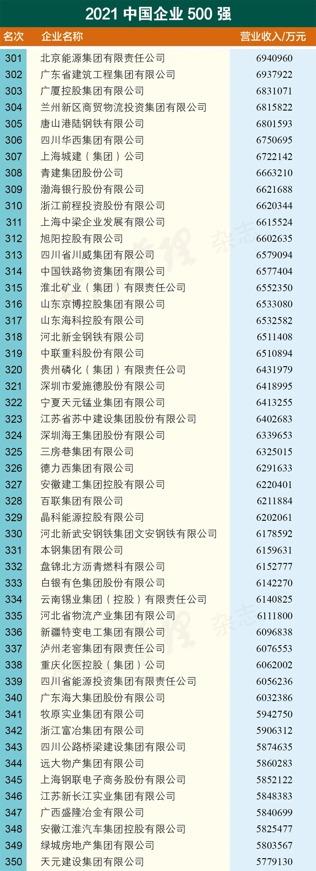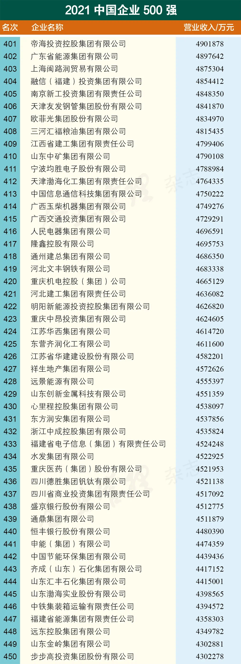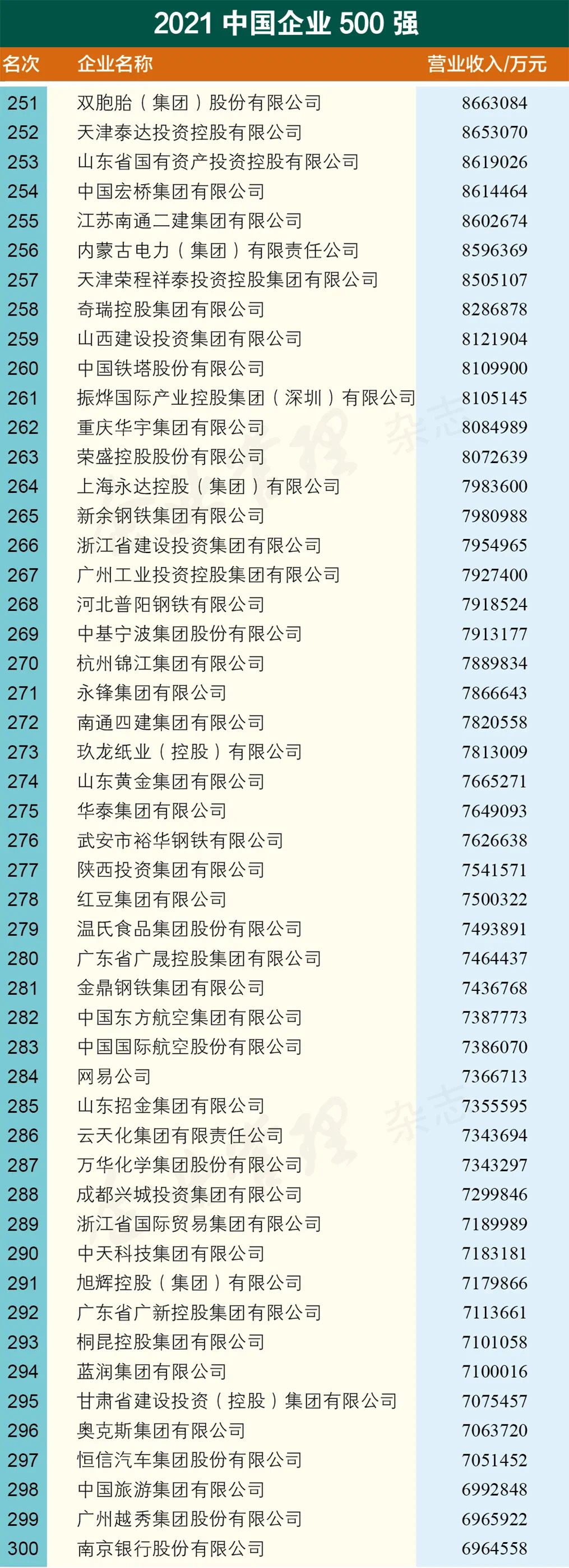 今天公布的“2021中国企业500榜单”共涉及75个行业。制造业企业数量249家,服务业176家,其他行业75家。与上年相比,制造业企业数量较快增加,增加量达到了11家,逆转了前两年制造业企业数量减少的态势。同时,产业结构继续优化,战略性新兴产业企业和现代服务业企业分别增加了8家和6家,房屋建筑企业、煤炭采掘企业分别减少了10家和6家。