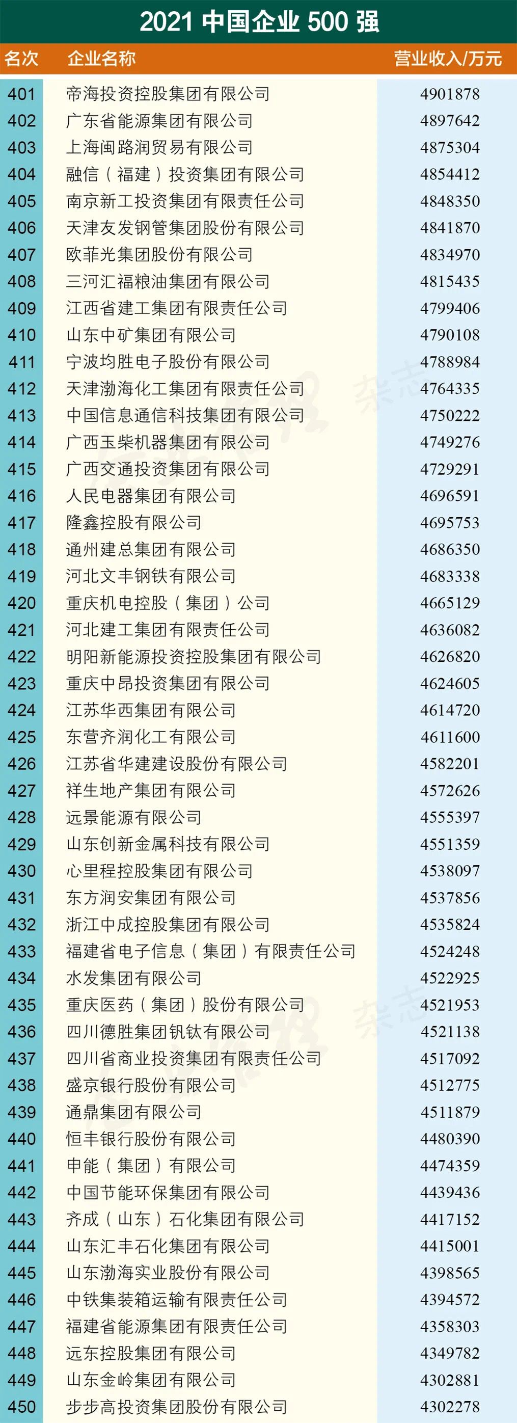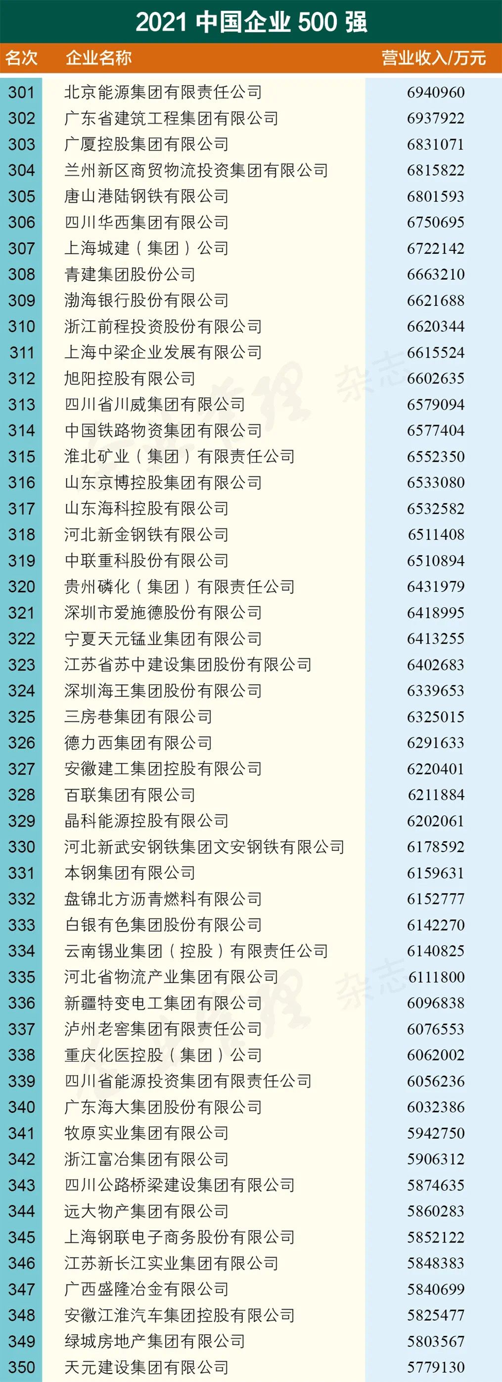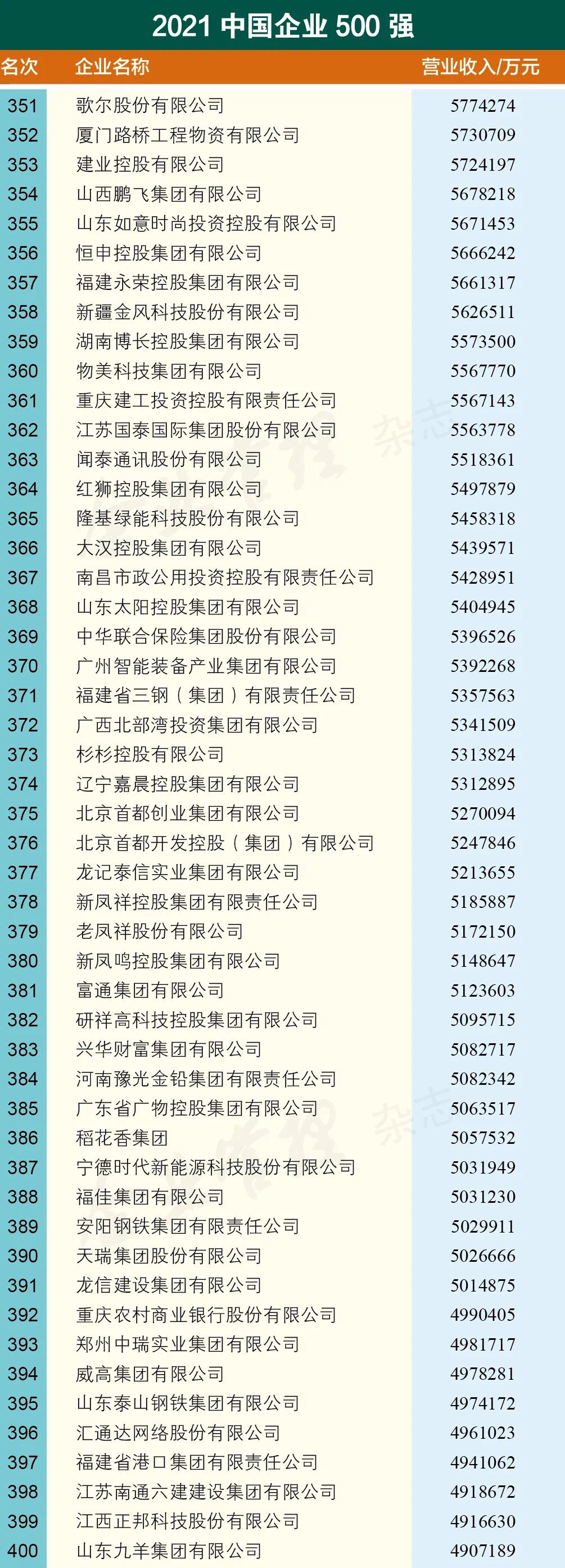 中国企业500强榜单由中国企业联合会、中国企业家协会发布,已成为观察中国企业发展的风向标之一。该榜单按营业收入排名,2021年入围门槛为392.36亿元,比上年提高了32.75亿元。据悉,2021年中国企业500强逆势增长,共实现营业收入89.83万亿元,比上年增长了4.43%;千亿企业增加5家,达到222家;8家企业营业收入超过万亿元,显示出我国企业面对复杂环境成长步伐稳健。