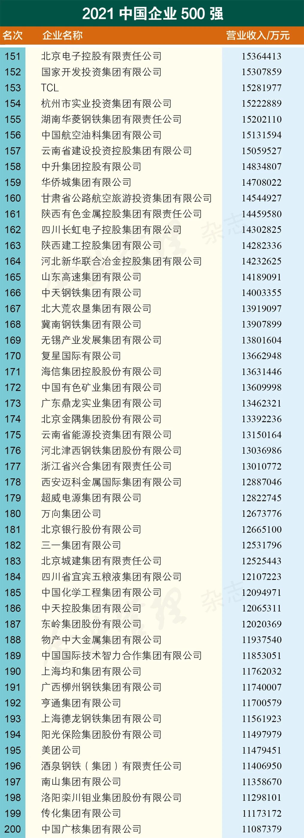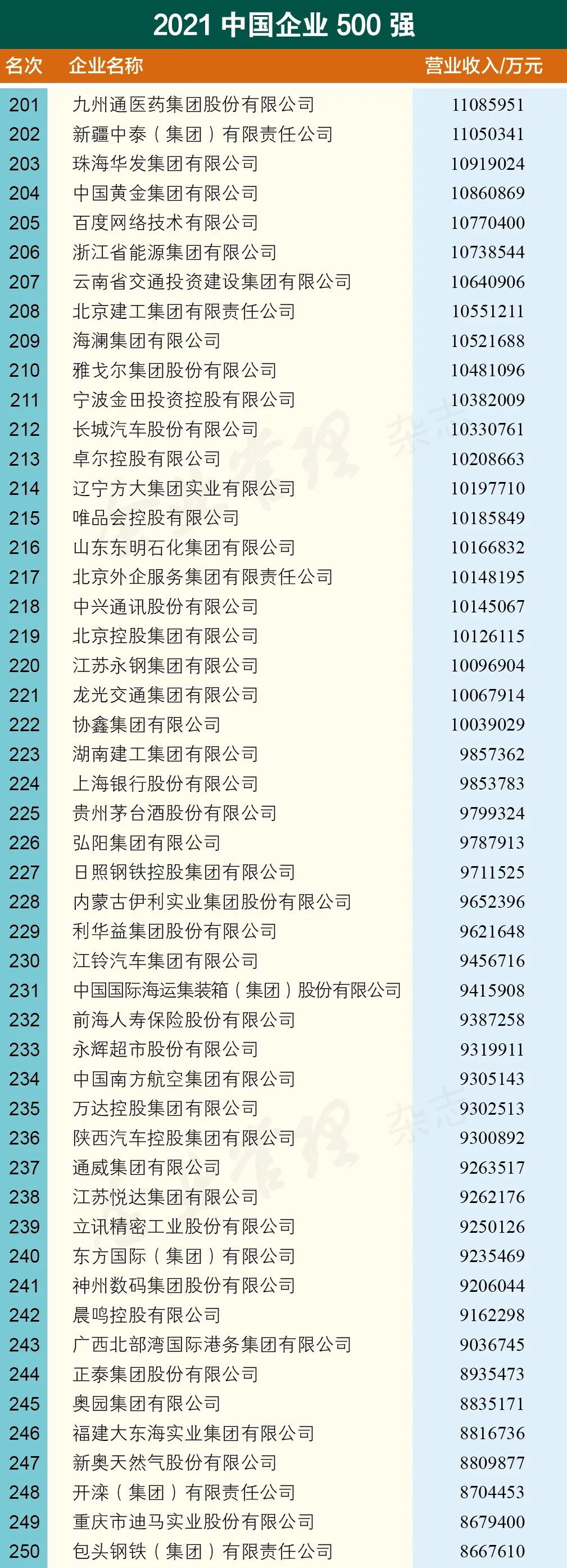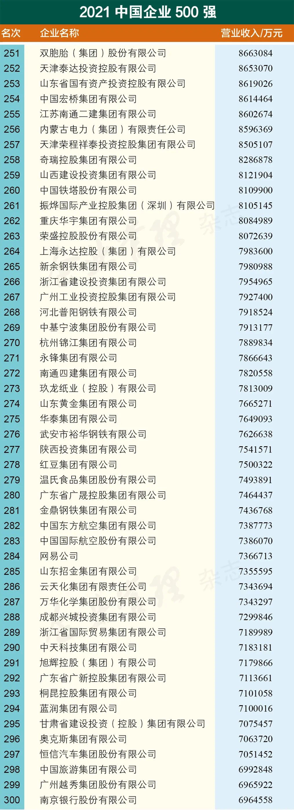 中国企业500强榜单由中国企业联合会、中国企业家协会发布,已成为观察中国企业发展的风向标之一。该榜单按营业收入排名,2021年入围门槛为392.36亿元,比上年提高了32.75亿元。据悉,2021年中国企业500强逆势增长,共实现营业收入89.83万亿元,比上年增长了4.43%;千亿企业增加5家,达到222家;8家企业营业收入超过万亿元,显示出我国企业面对复杂环境成长步伐稳健。