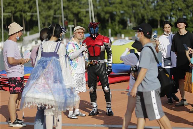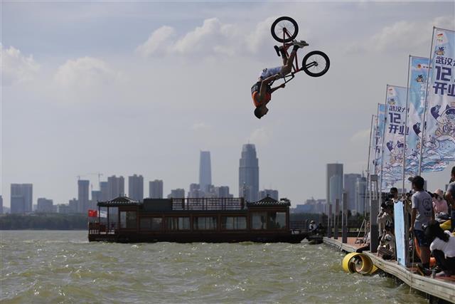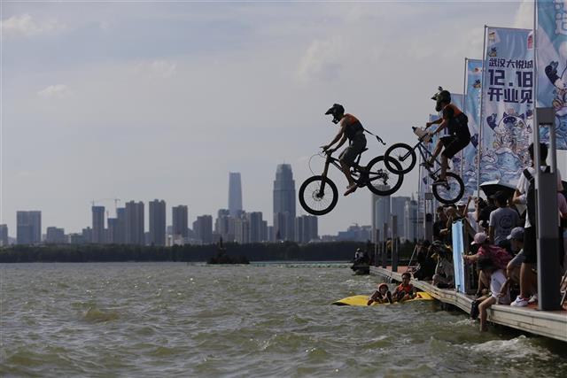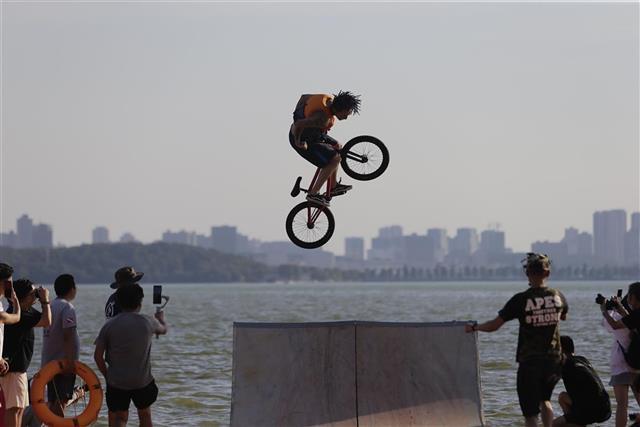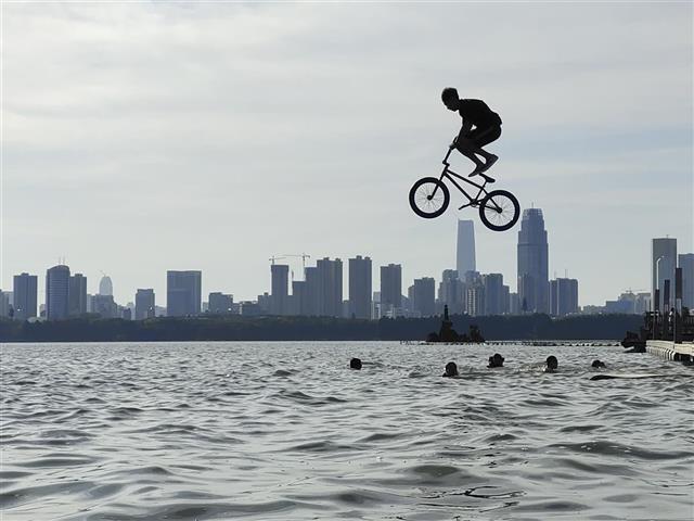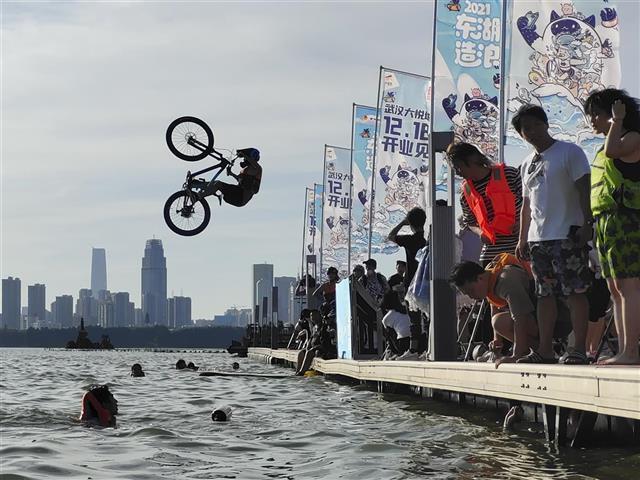 2021年9月25日,连日持续高温,在武汉东湖绿道湖心岛帆船基地,小轮车爱好者们骑着车以各种高难度技巧跳入湖中。当日,一大群小轮车爱好者们齐聚东湖举行东湖造浪节,以青年人特有的方式表达对武汉这座城市的热爱。 (湖北日报全媒记者 倪娜 通讯员 南飞)