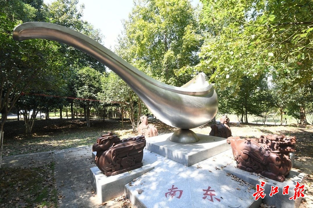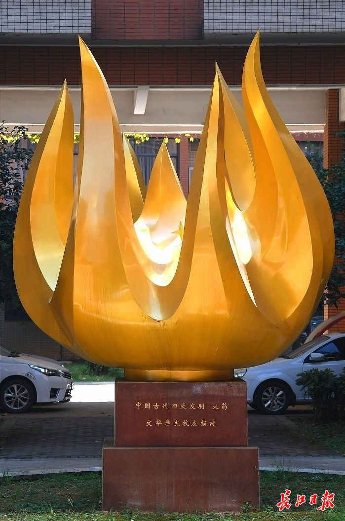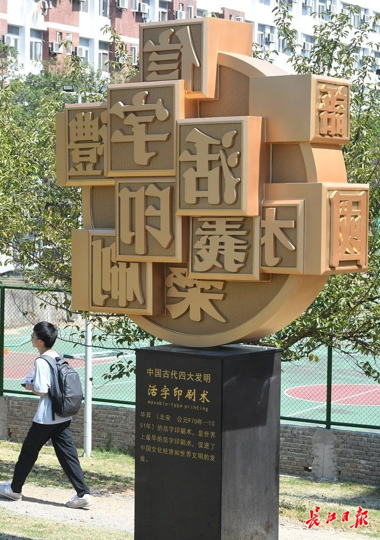长江日报大武汉客户端9月26日讯 9月26日,文华学院新建成的中国古代四大发明雕塑亮相校园。“指南针”雕塑用不锈钢锻造而成;“火药”雕塑在设计上选用中国火纹,上面有六个小星星;“造纸术”雕塑以清晰的脉络痕迹展现“造纸”情景。“活字印刷术”雕塑坐落在学校新食堂和6A篮球场之间。学校通过提亮校园文化环境增强爱国主义教育,提高校园文化品位,提升校园文化育人环境。(长江日报记者李子云 通讯员童玲 摄影报道)