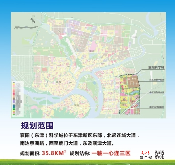 襄阳(东津)科学城位于东津新区东部,北起连城大道,南达蔡洲路,西至鹿门大道,东及襄津大道,规划总面积35.8平方公里。“一轴一心连三区”即科学城以建设中的科学大道为中轴,串联依肖坡水库而建的云湖科学中心,以及自北向南依次分布的智慧产业区、科创综合区、科技商服区。科学城将按照科创、教育、产业协同发展思路,充分发挥大学校区、产业园区、城市社区融合发展的特色优势,规划建设实用场景。