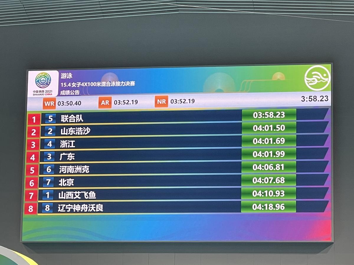 在此之前进行的的女子4×100米混合泳接力决赛中,鄂将陈洁与国家队队友组成联合队,以3分58秒23夺冠。