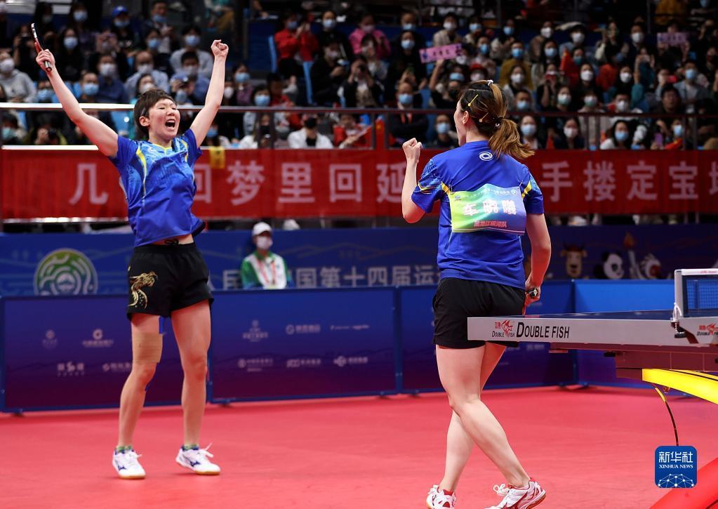 当日,在陕西延安进行的第十四届全运会乒乓球项目女子双打决赛中,黑龙江队组合王曼昱/车晓曦以4比0战胜辽宁队组合王艺迪/陈幸同,获得冠军。