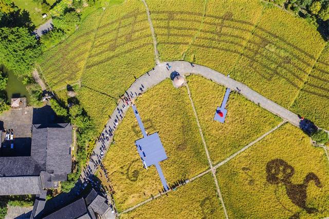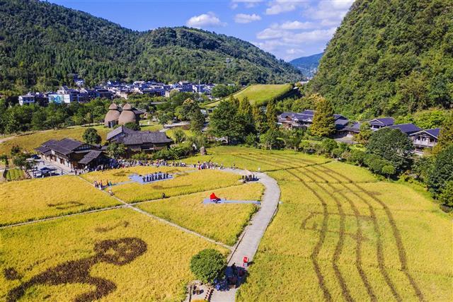 俯瞰张家界武陵源黄龙洞广场“丰收节”稻谷飘香美景。(湖北日报全媒记者 梅涛 摄)