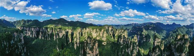 俯瞰张家界武陵源景区,群峰与蓝天白云相互映衬,美不胜收。(湖北日报全媒记者 梅涛 摄)