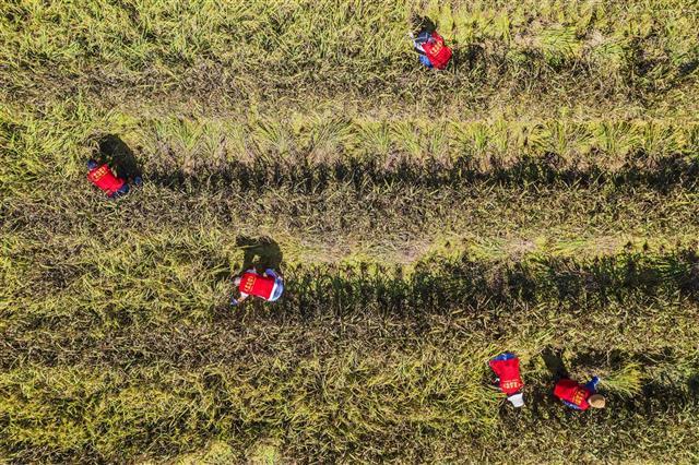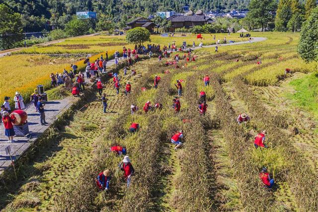 俯瞰张家界武陵源黄龙洞广场“丰收节”上收割稻谷场景。(湖北日报全媒记者 梅涛 摄)