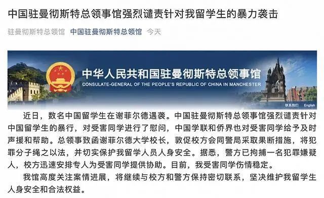 近日,数名中国留学生在谢菲尔德遇袭。中国驻曼彻斯特总领事馆强烈谴责针对中国留学生的暴行,对受害同学进行了慰问,中国学联和侨界也对受害同学给予及时声援和帮助。