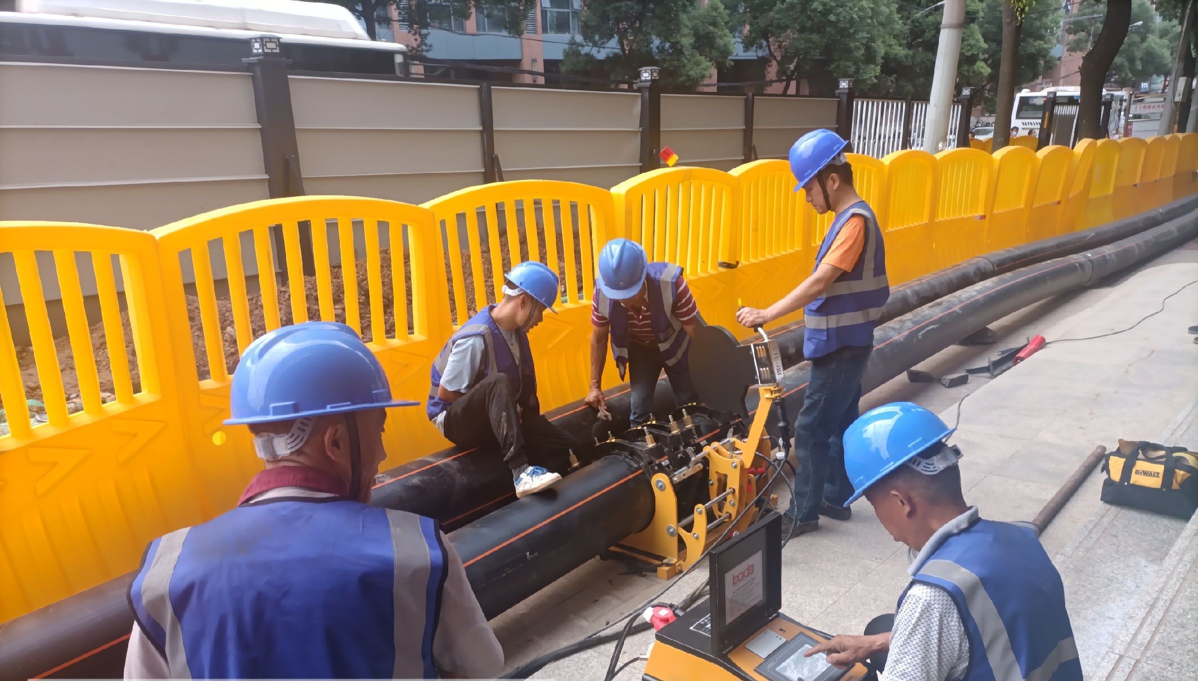 丁字桥路道路整治提升工程启动,工人们正在焊接新建管道。通讯员陈允智 摄