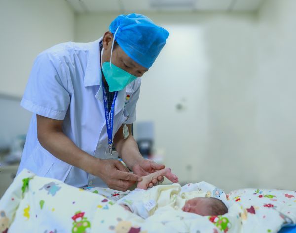 膝反曲的孩子,小腿向上翻折,犹如高难度的劈叉动作。通讯员张祖国 摄
