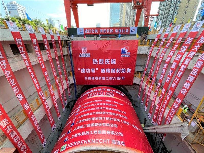 作为北横通道东段建设首条掘进的盾构区间,“建功号”盾构机自福建北路工作井始发后,将一路向东掘进,至梧州路井率先接收,长1538米。在梧州路工作井过站后,继续掘进至安国路工作井接收,长1288米。负责掘进的“建功号”泥水平衡盾构机,是上海目前最大的盾构机之一,总长度125米,重3500吨,盾体长度14米,刀盘开挖直径15.56米,最大推进速度50毫米/分钟。