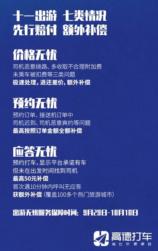 在司机应答保障方面,高德打车承诺,乘客如遇平台未按时指派司机,将提供最高50元补偿。另外在100多个热门出游城市,乘客首次遇到10分钟内呼叫无应答情况时,还将获得额外补偿。