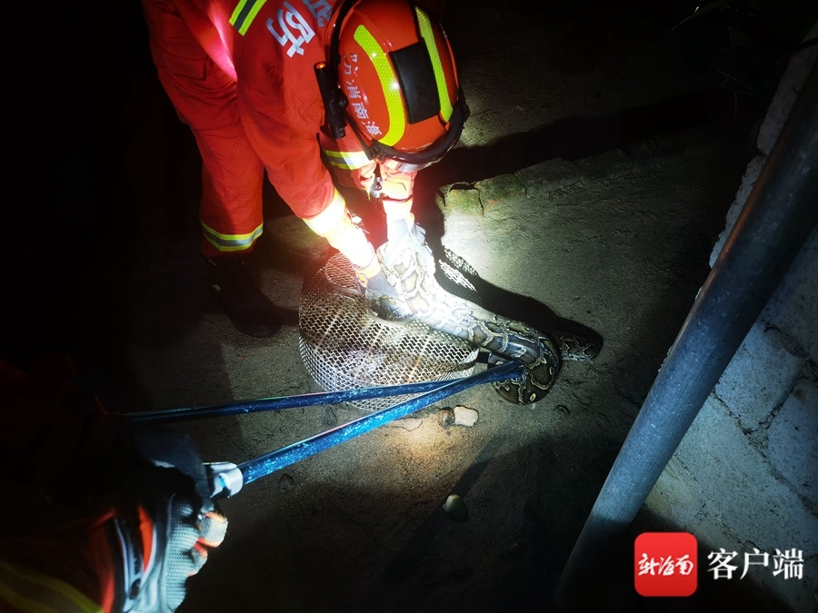新海南客户端、南海网、南国都市报9月29日消息(记者 林师堂 通讯员 李海英 龙宣儒 )9月27日21时58分,保亭黎族苗族自治县保城镇新星农场五区四队一农户家中闯入一条蟒蛇,还想吃鸡,随后赶到的消防员迅速将其捕获。