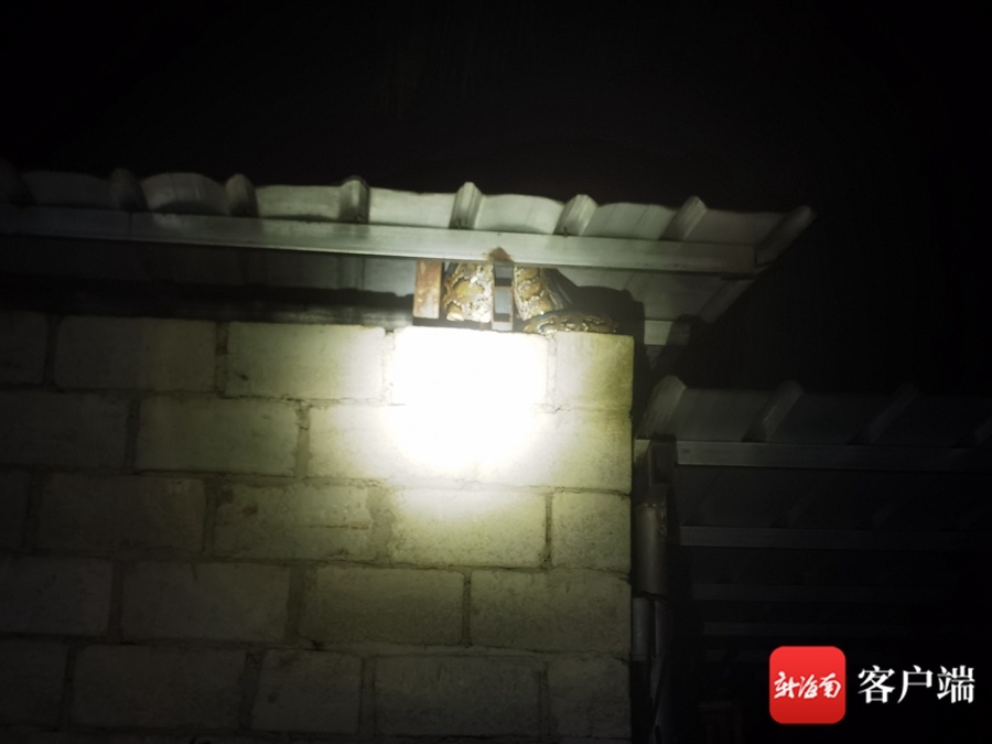 据了解,当时农户听到鸡舍有异响,用手电筒一照,发现一条长约2米、重达20斤左右的大蟒蛇正在用身体把一只鸡缠绕致死,还来不及吃,便爬到铁皮房屋檐上盘卷着。农户不敢自行抓捕,于是拨打“119”报警。