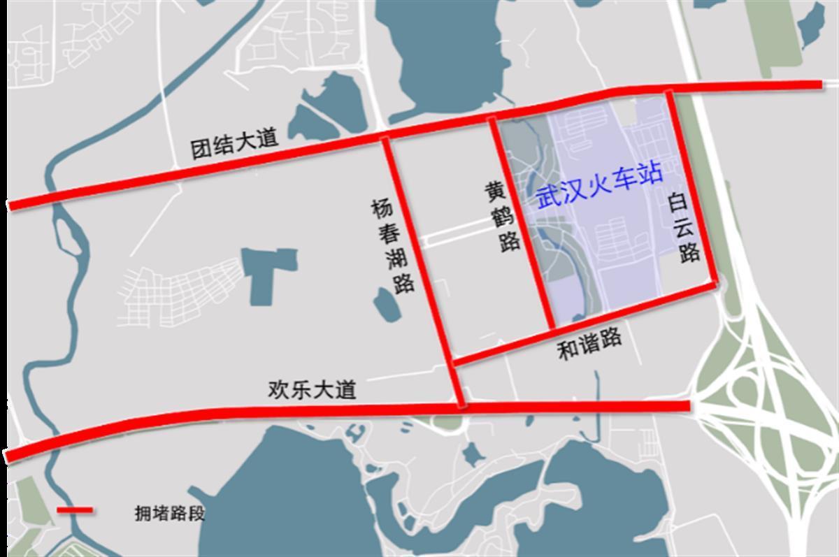 武汉火车站区域预计总体相对较为平稳,拥堵消散较快。周边道路预计在9月30日的13时至23时出现不同程度的拥堵;1日至7日,欢乐大道、团结大道易出现短时拥堵现象,白云路、黄鹤路受火车运送班次的影响,拥堵持续时间较长且主要集中在白天7时至8时以及10时至15时。