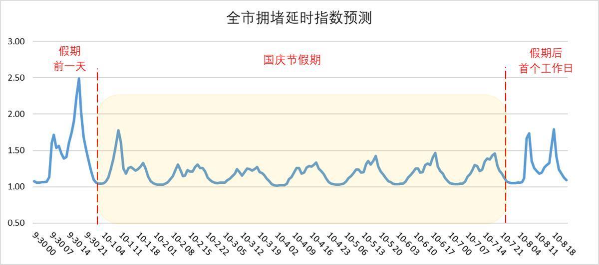 根据历史数据预测,在9月30日(假期前一日)出城车流与通勤车流叠加,全市达到拥堵延时指数最高峰,交通压力最大,预计全市交通自下午15时开始出现中度拥堵,16时至19时呈现严重拥堵;预计假期首日9时至11时出现一波进出城高峰,但比前一日拥堵程度总体降低;从10月6日开始陆续出现返城交通流,但较为分散。