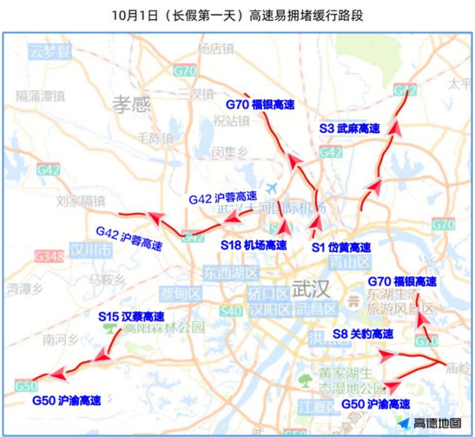 假期首日,预计S15汉蔡高速(索河互通到S50沪渝高速出入口)、G50沪渝高速(S15汉蔡高速出入口到北河收费站)、S3武麻高速(巨龙收费站到丁家大湾高架桥)、G42沪蓉高速(府河大桥到汉北河1号大桥)、G50沪渝高速(凤凰山收费站到鄂州服务区)、G70福银高速(B跨线桥到孝天路大桥)、S8关豹高速(新武黄立交到鄂州服务区)、S18机场高速(丰荷山互通到常青立交)、G70福银高速(九龙大桥到邹黄互通)、S1岱黄高速(府河大桥到B跨线桥)在凌晨0至3时、上午6时至15时可能出现拥堵缓行现象,拥堵持续7至12小时左右。