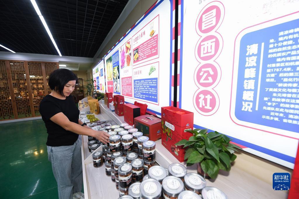 9月29日,在杭州市临安区清凉峰镇新农人创客中心,返乡创业青年俞冬红在展示柜前整理货物。俞冬红成立了“昌西公社”,立足清凉峰国家级自然保护区生态优势,构建山核桃、小香薯、桃酥、高山蔬菜等农副产品产销无缝对接平台。