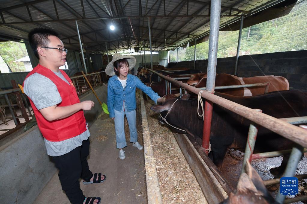 9月29日,在杭州市临安区清凉峰镇大鹄村,清凉峰镇团委副书记王再超(左)和陈柳在对接全镇养牛技术培训事宜。