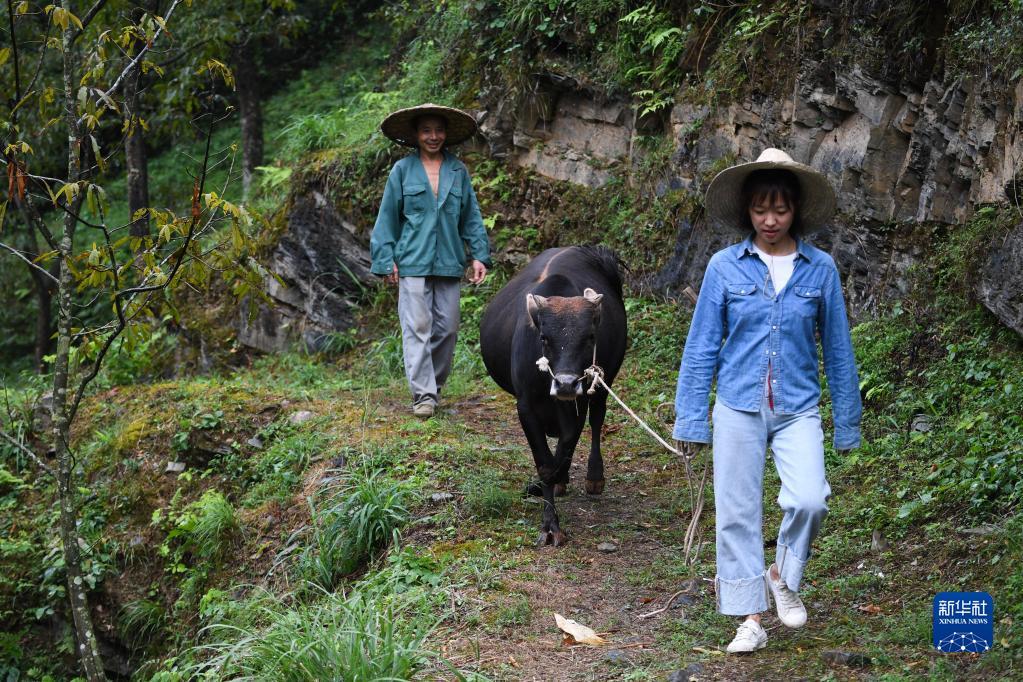 9月29日,在杭州市临安区清凉峰镇大鹄村,90后创业青年陈柳(右)把一头小黄牛从山上带回牛舍。6年前,她辞去城市里的工作,回到家乡当起“放牛娃”。凭借不断引进先进养殖技术和创新营销模式,陈柳和小伙伴们一步步深挖家乡小黄牛产业链和经济效益,带动全镇50多户农户通过养牛走上了致富路。