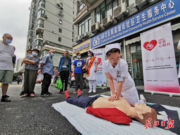 同济医院心内科护士现场教居民做心肺复苏。长江日报记者余丹夏 摄