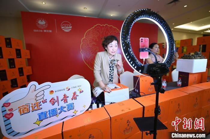 论坛现场,“宿有千香·霸王蟹”工作人员直播卖蟹。 刘登书 摄