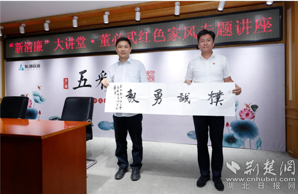 讲座结束后,董绍壬代表湖北省董必武思想研究会向东湖高新集团题赠“朴诚勇毅”书法作品。
