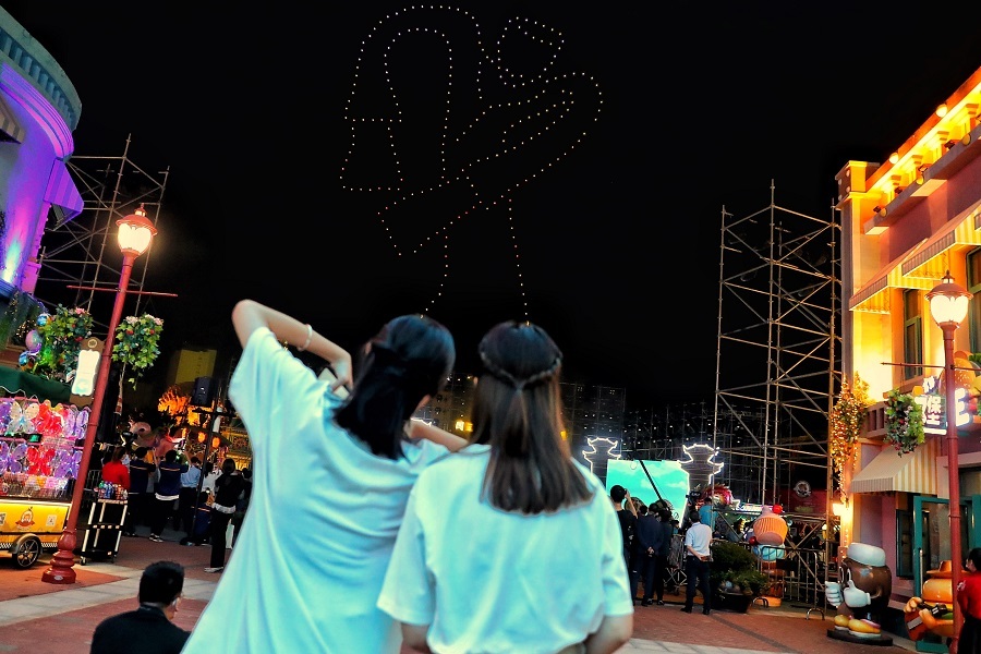 无人机在夜空中组成汉舞俑造型。(中国日报记者 姜东 摄)