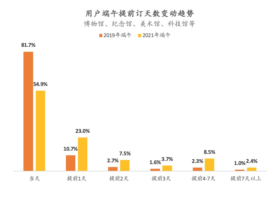 得益于预约旅游的政策引导,以及各地景区的实践,国内游客对预约旅游的接受度正在不断提高。美团门票数据显示,以文博场馆为例,2021年至今较2019年,用户当日购买门票的比例下降17.3个百分点,提前1天预订的比例上升10个百分点;在刚刚过去的端午小长假中,用户当日购买门票的比例下降26.8个百分点,而提前订的比例,有不同幅度的增加。美团App、大众点评App的游客评价中,提及“网络预约”的占比也在持续提升。