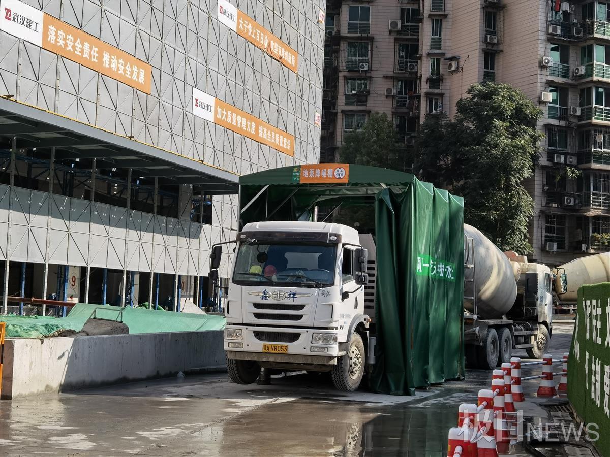 9月30日,极目新闻记者现场看到,混凝土输送泵隔音棚内,一辆商品砼车正在向楼内“打”混泥土,由于在棚内作业,噪声不大。