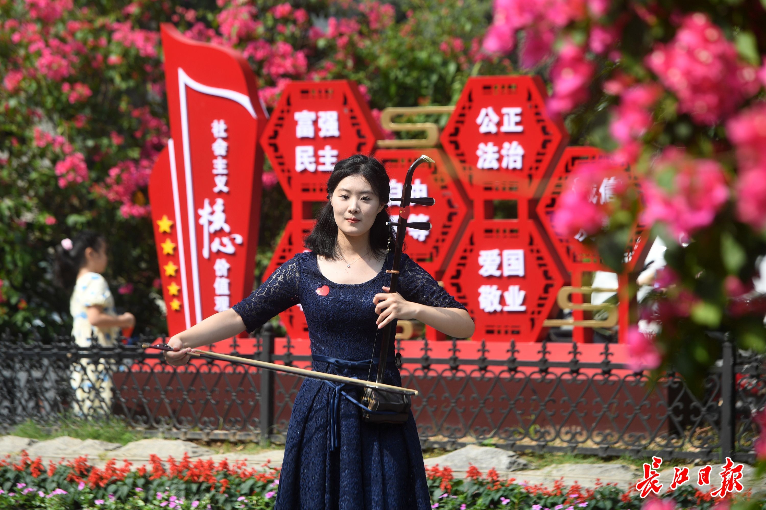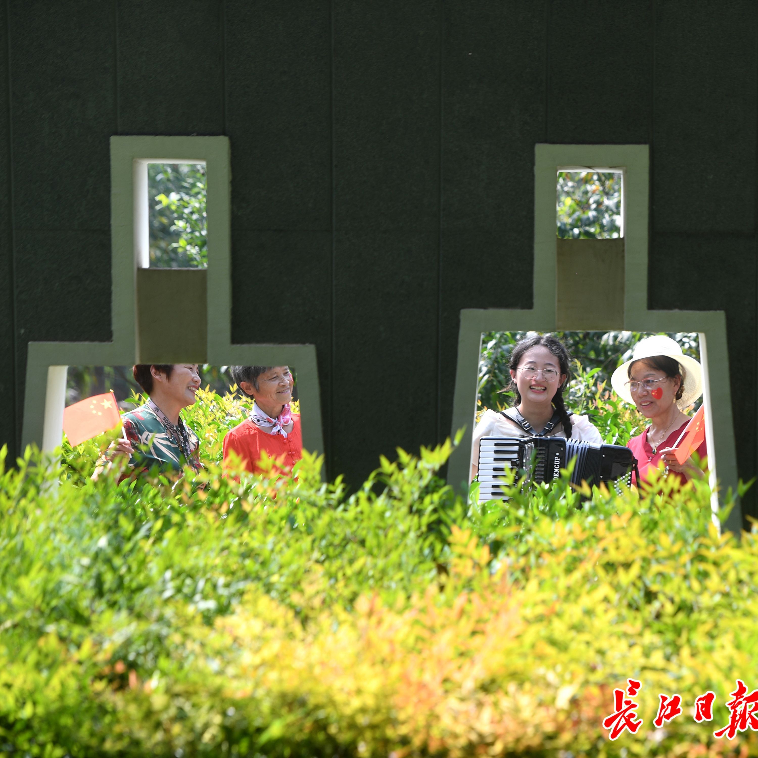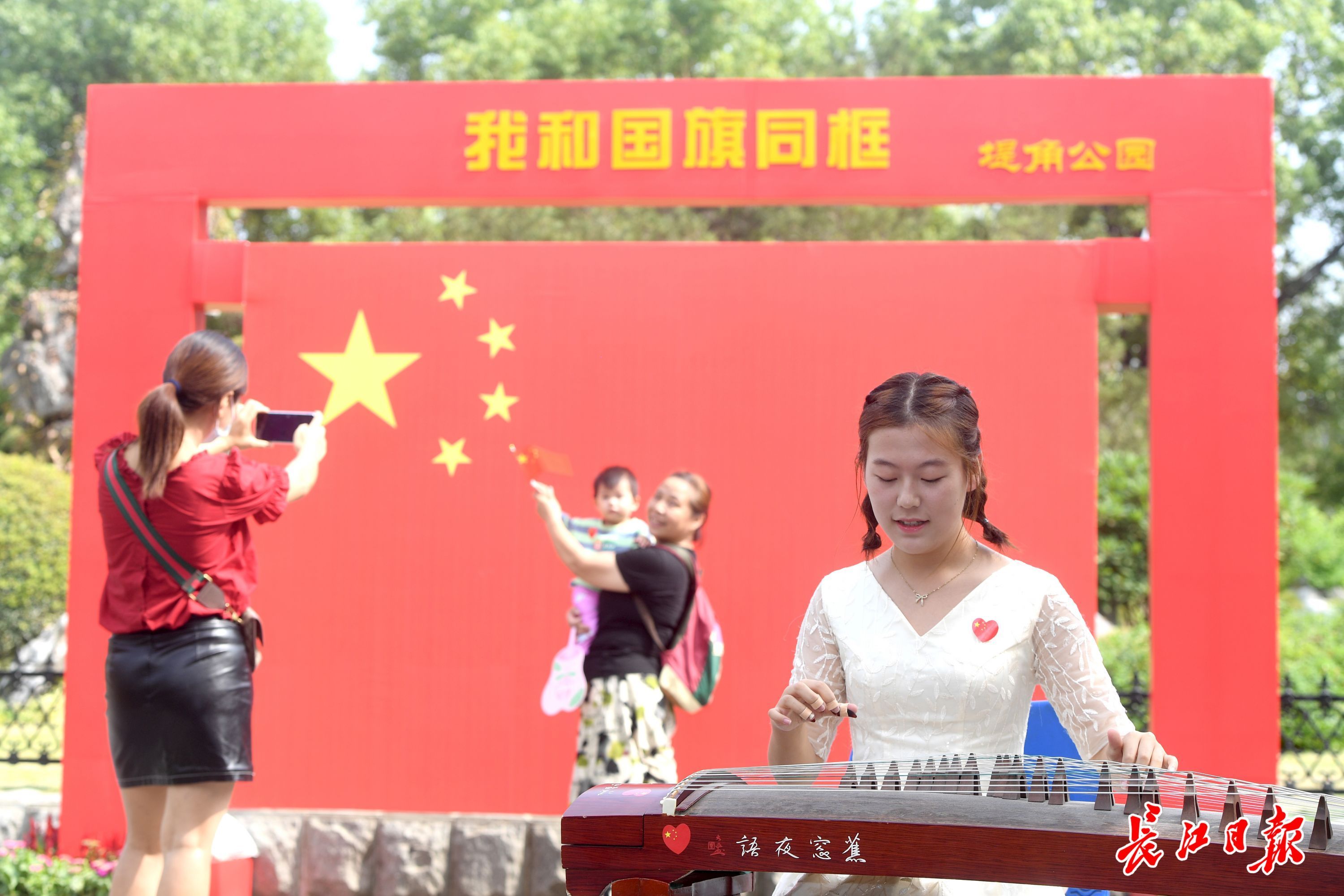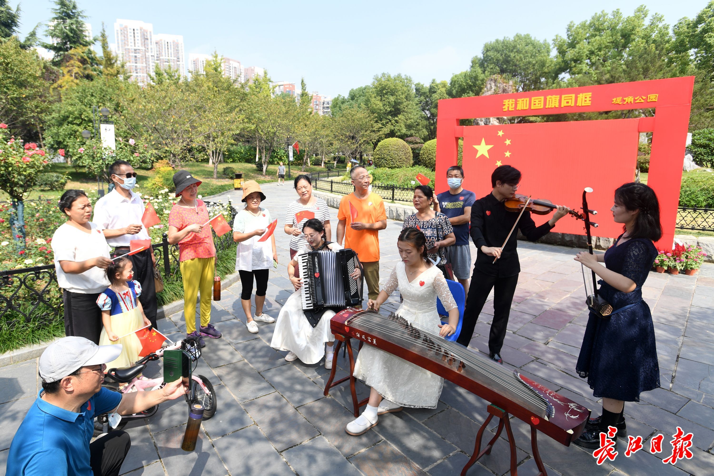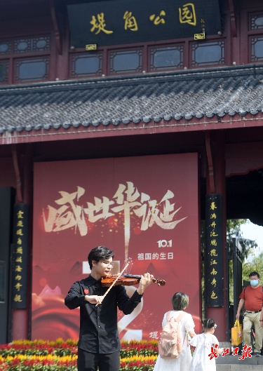 长江日报大武汉客户端10月1日讯 “我和我的祖国,一刻也不能分割……”2021年10月1日上午,一场“致敬我的祖国·音乐快闪”活动在江岸区堤角公园上演:悠扬的手风琴、激昂的小提琴、动人的二胡、清脆素雅的古筝,来自湖北中医药大学艺术团的梁家乐、覃瀚宗、曹思邈、张明茹四位大学生,在公园南大门、蓬岛、闻风阁、中国园等处演奏《我和我的祖国》《我爱你,中国》《歌唱祖国》《钢铁洪流进行曲》《国家》《喀秋莎》《绒花》等乐曲,引发不少游客共鸣,纷纷挥舞着手中的国旗一同合唱。