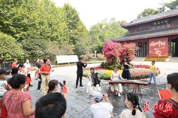 “当音乐响起时,我的心中充满了身为中国人的自豪感。”在此游园的武汉纺织大学大二学生袁亚楠偶遇了这场快闪活动并主动参与其中。